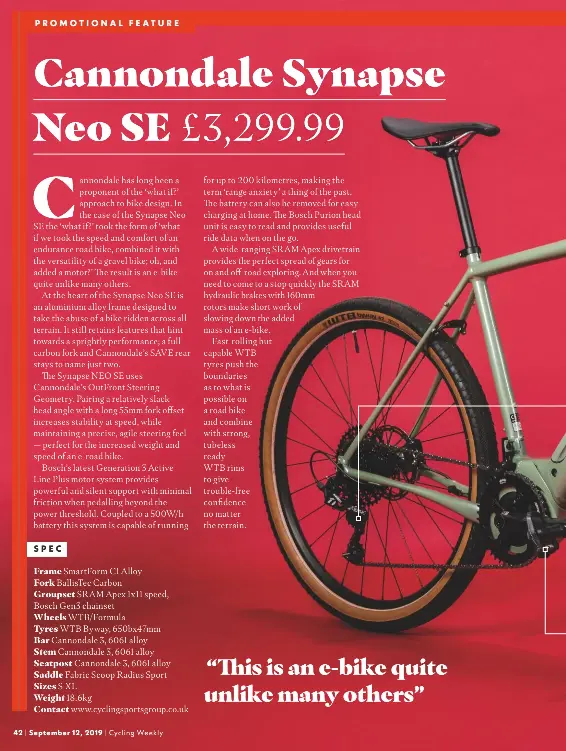 The cannondale synapse neo se is the e bike you ve been waiting for it has a super quiet bosch active line plus motor and is one of the most natural feeling gravel e bikes we ve ridden to. Advertisement cannondale synapse neo se e road bike. Your rides will go longer. The 2019 cannondale synapse neo is available in canada in three models and comes in four sizes.